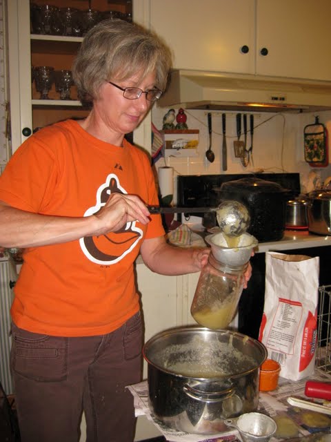 You pour the molten hot apples into the hopper in the top, trying not to let any cascade onto the floor or onto your own tender skin. (Good luck with that). Then you simply wind the crank and voila! Applesauce comes out one chute and peels come out the other and you're coming down the home stretch. We just love Victorio. He is so efficient!
